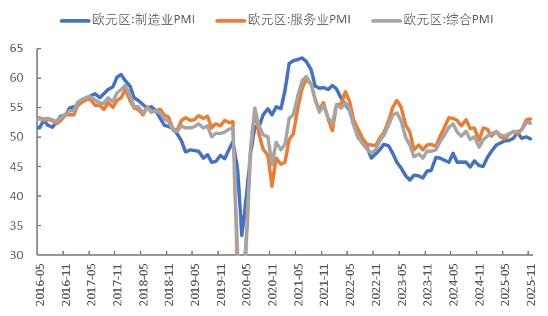 11月欧元区PMI表现分化,服务强而制造弱。欧元区11月制造业PMI初值为49.7,预期50.2,前值50;服务业PMI初值53.1,预期52.8,前值53;综合PMI初值52.4,预期52.5,前值52.5。欧元区主要国家中,德国11月制造业PMI初值为48.4,预期49.8,前值49.6;服务业PMI初值为52.7,预期54,前值54.6;综合PMI初值为52.1,预期53.5,前值53.9。法国11月制造业PMI初值为47.8,预期49,前值48.8;服务业PMI初值为50.8,预期48.4,前值48;综合PMI初值为49.9,预期48.1,前值47.7。英国11月制造业PMI初值50.2,预期49.2,前值49.7;服务业PMI初值50.5,预期52,前值52.3;综合PMI初值50.5,预期51.8,前值52.2。